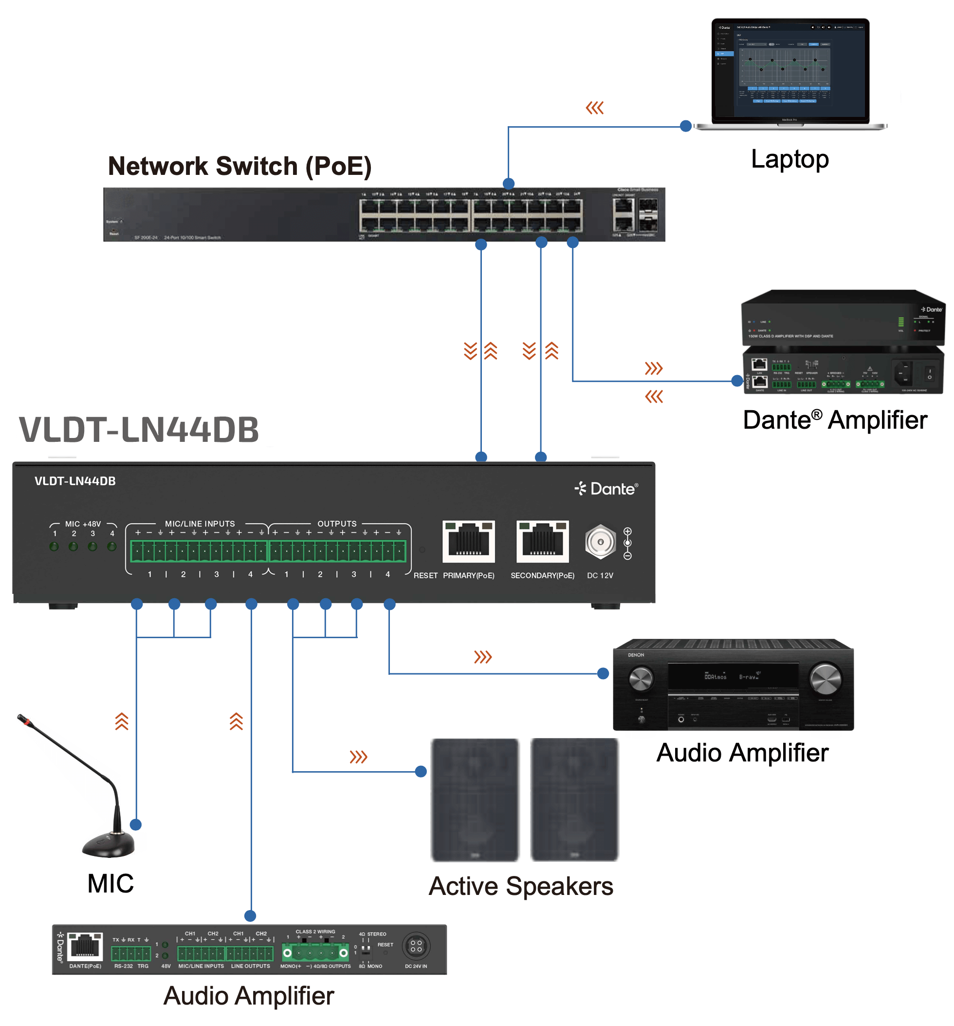 The VLDT-LN44DB audio bridge is a Dante® transmitter based on DEP scheme. It converts up to 4 Mic/Line balanced or unbalanced audio inputs and 4 balanced or unbalanced audio outputs to and from the Dante® audio standard. Analog audio input supports 48V phantom power supply and 6-level sensitivity adjustment, while analog output supports 5-level output adjustment.