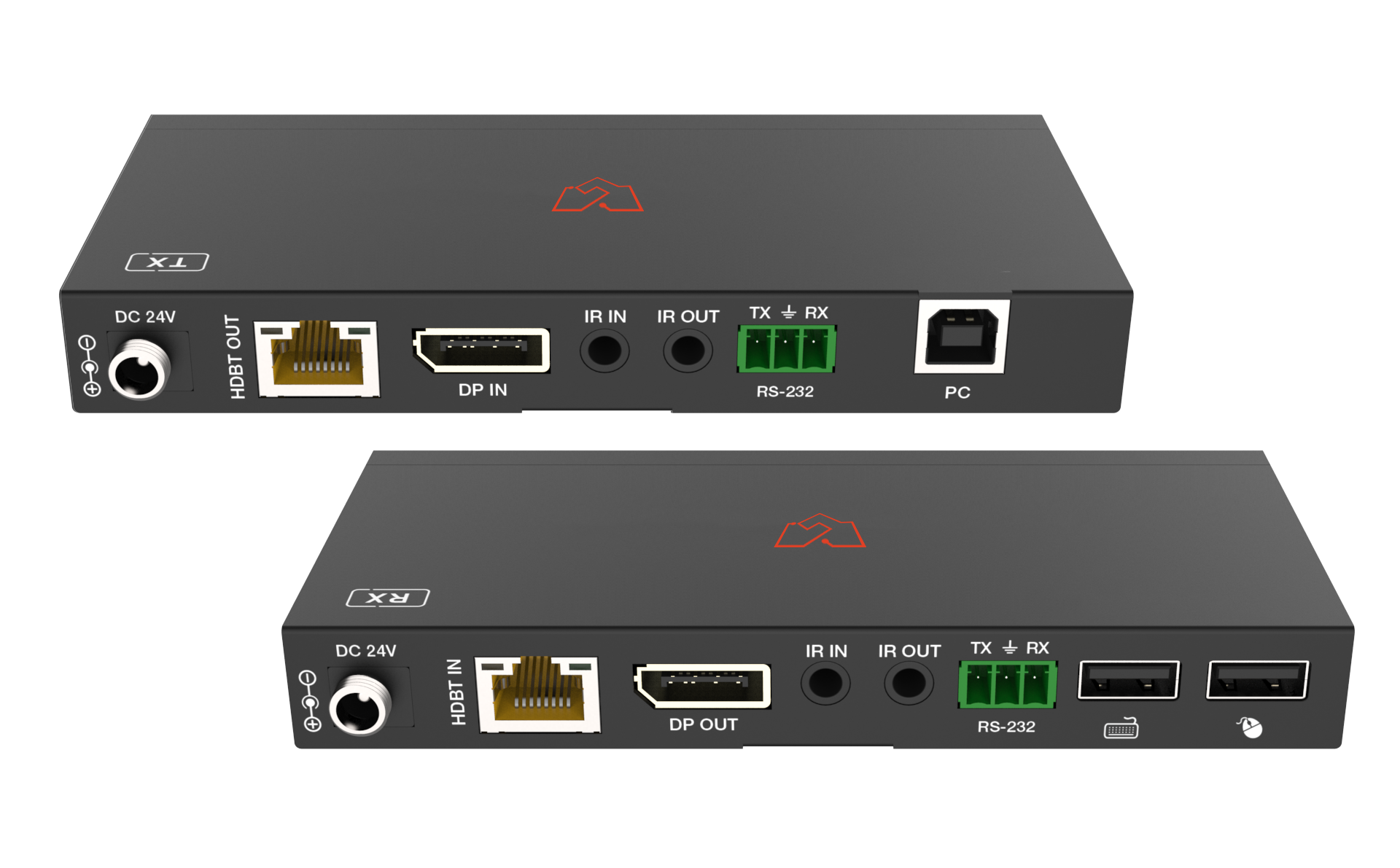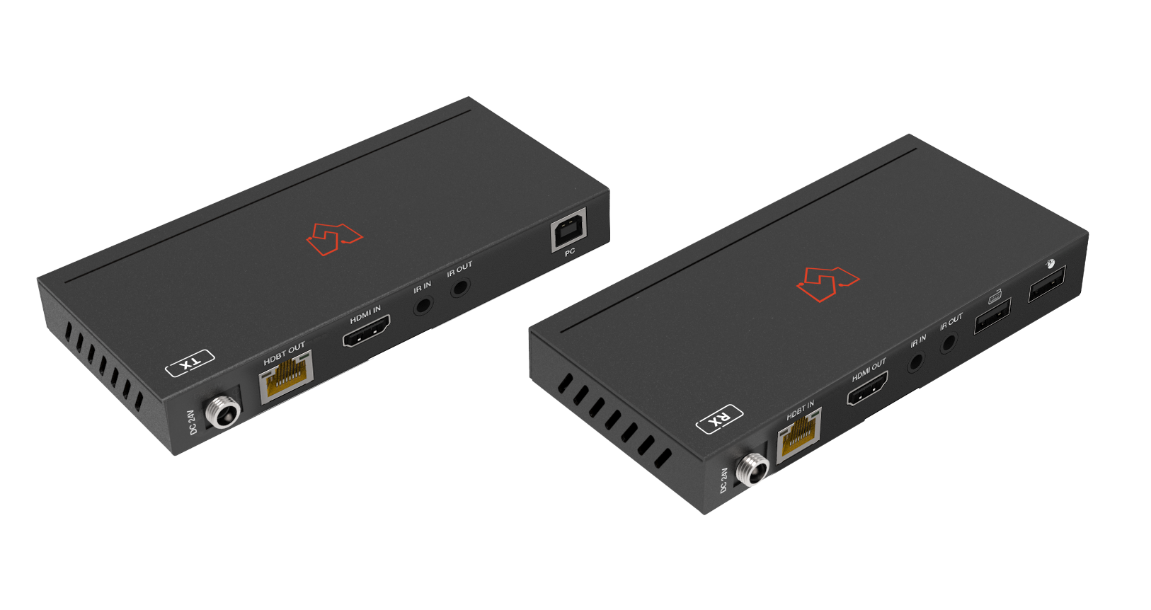 Single-cable simplicity — HDBaseT models carry HDMI video, USB, IR, RS-232, and PoE over a single Cat6/6A cable, eliminating separate conduit runs for control and power
