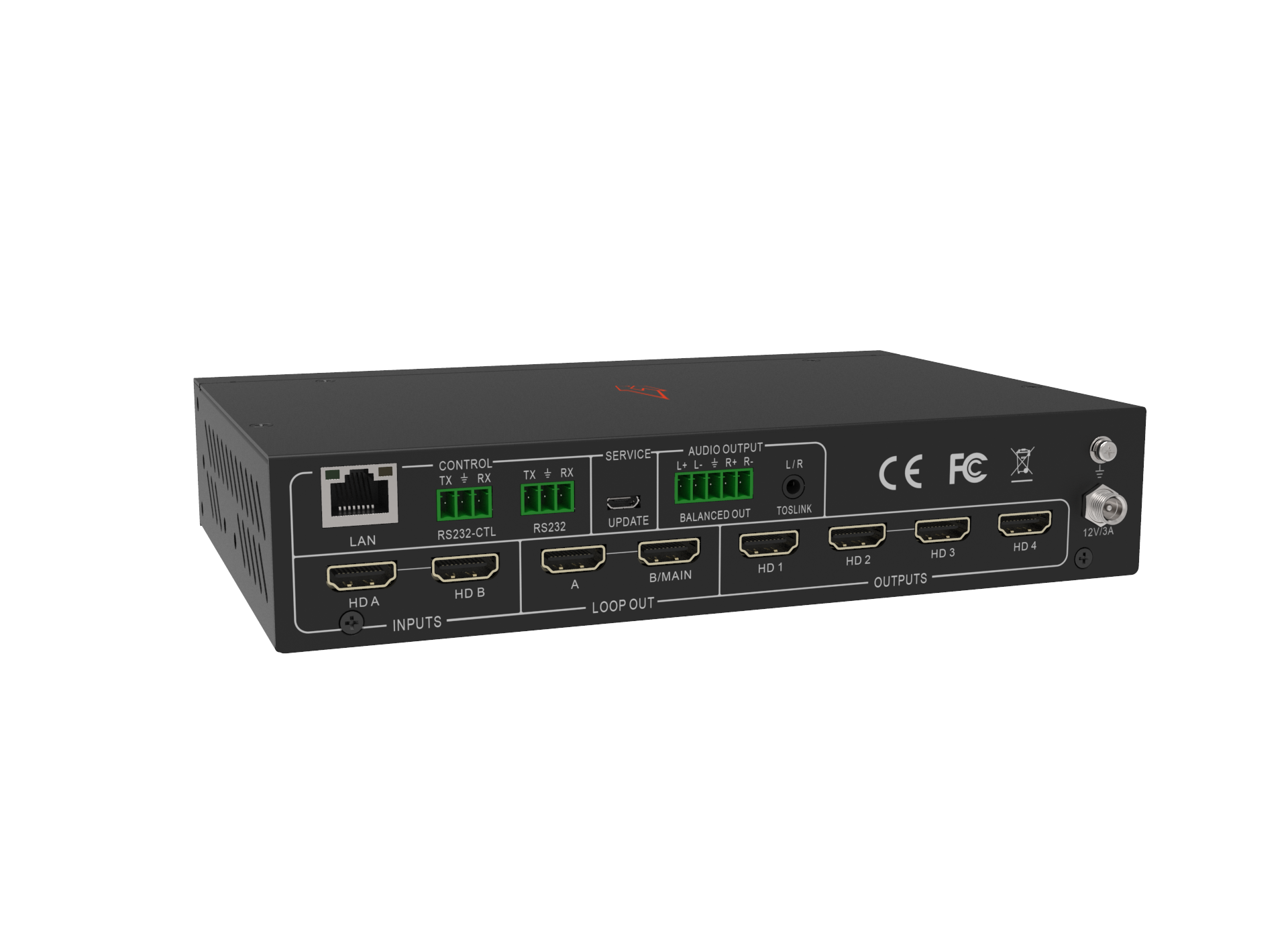Dedicated Videowall Processor (VLVW-MX24P): A focused 2-input, 4-output HDMI 2.0 videowall processor at 18Gbps — the correct choice when the primary requirement is splitting or routing one or two sources across a 4-panel display array. The VLVW-MX24P handles tiling, bezel correction, and layout configuration for 1×4, 2×2, and other 4-screen arrangements without the overhead of matrix switching. Choose this model for retail digital signage, lobby displays, and event environments where source count is limited and output simplicity is the priority.