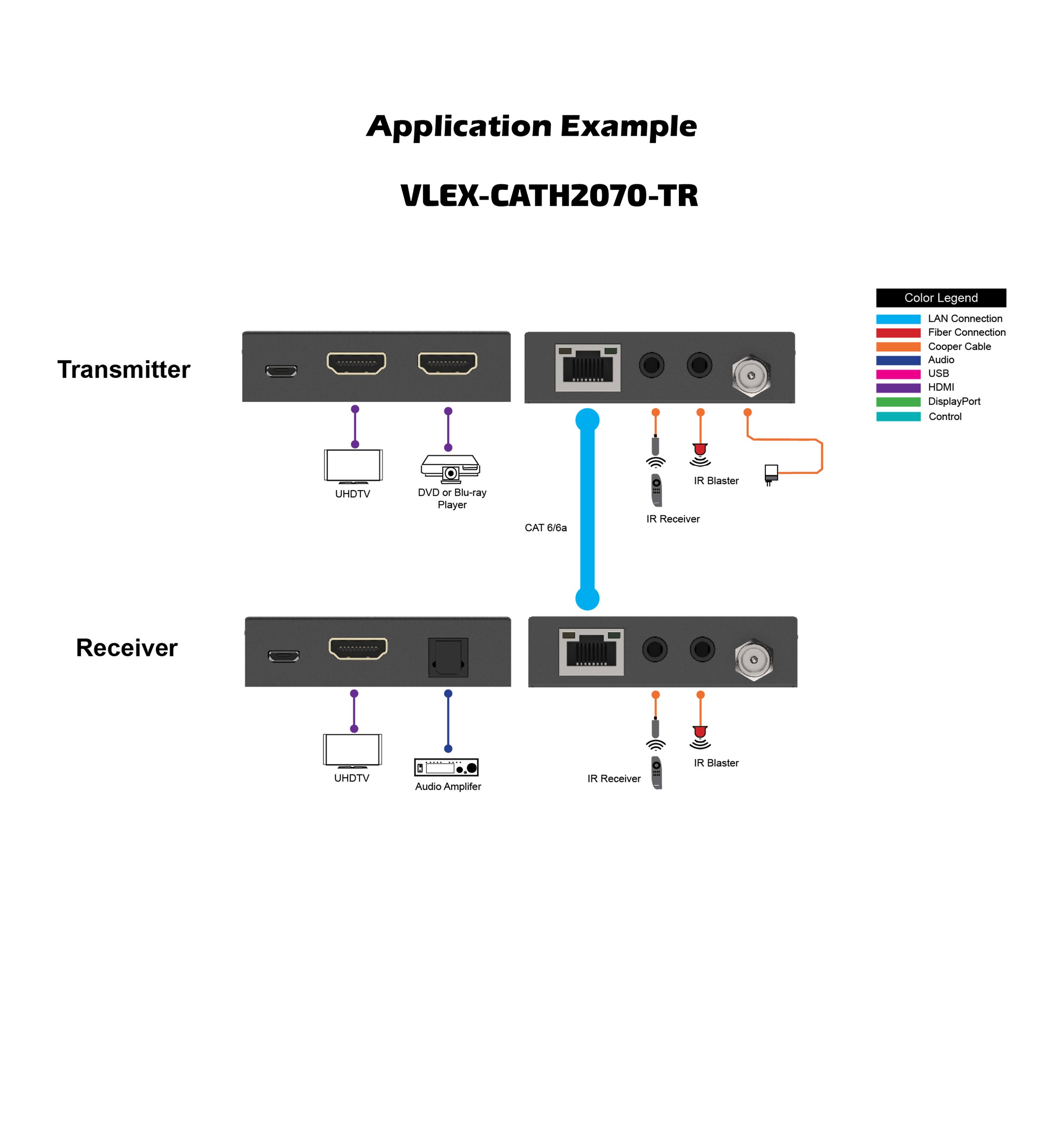 Extend HDMI HD signal and IR control signal to a distance up to 230ft / 70m via a single CAT6/6a cable, which can achieve zero-delay uncompressed long-distance transmission between the transmitter and receiver.