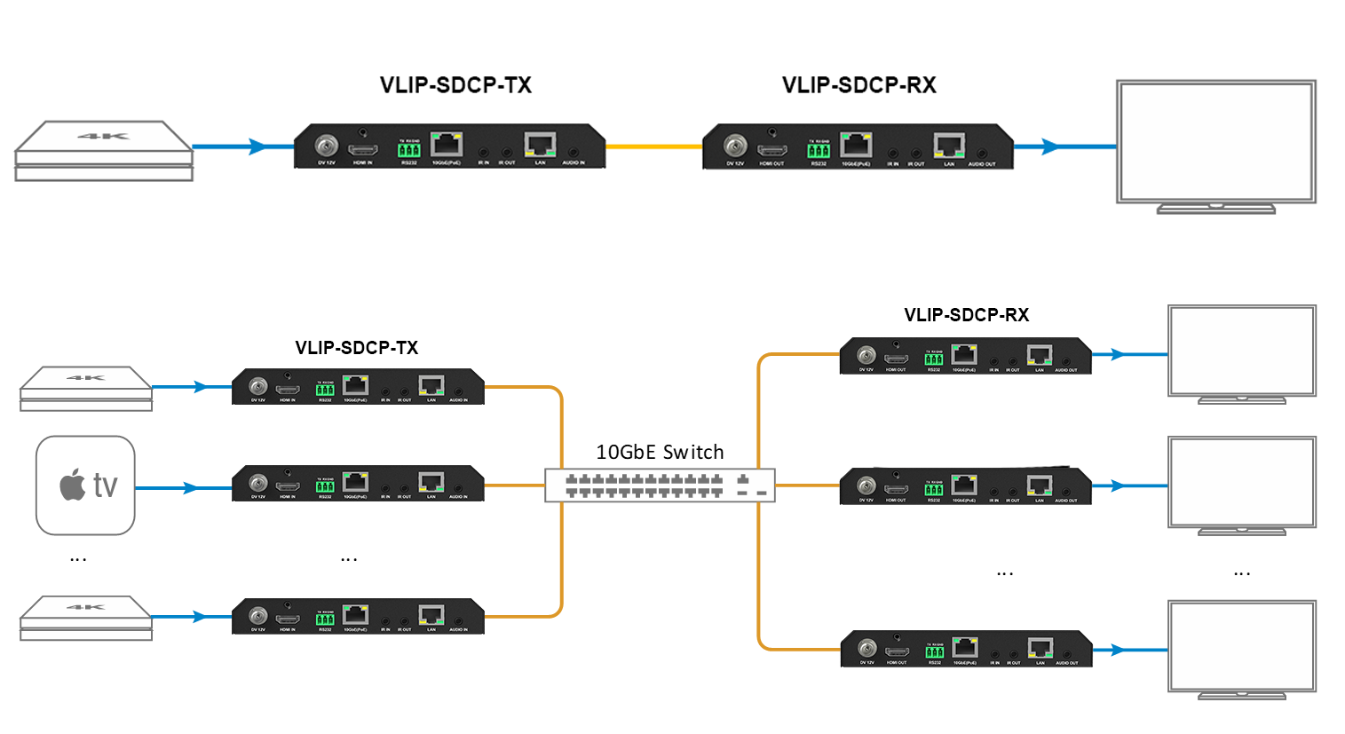 VLIP-SDCP-EXT is a high-performance SDVoE-based AVoIP extender Tx and Rx pair engineered for uncompromised 4K AV signal extension. With HDMI 2.0 input and 10GBase-T network output, it delivers crystal-clear 4K@60Hz (4:4:4) video with zero latency and zero compression, making it ideal for real-time applications where image integrity is critical for a complete end-to-end SDVoE distribution solution built for today’s most demanding AV networks.