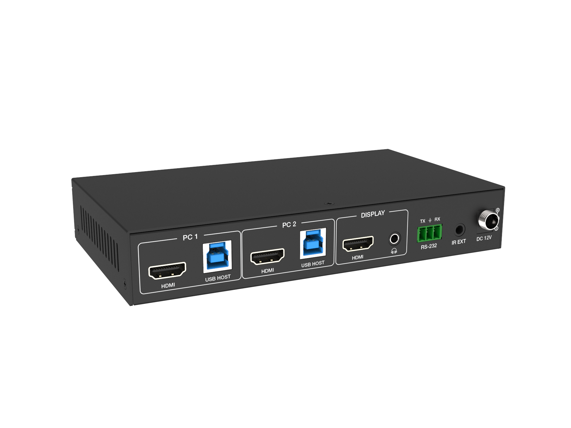 A built-in virtual interaction feature automatically wakes connected PCs from standby, reducing switching time. Users can switch between sources via front panel buttons, IR remote, or hotkeys from a keyboard or mouse connected to the dedicated USB port.