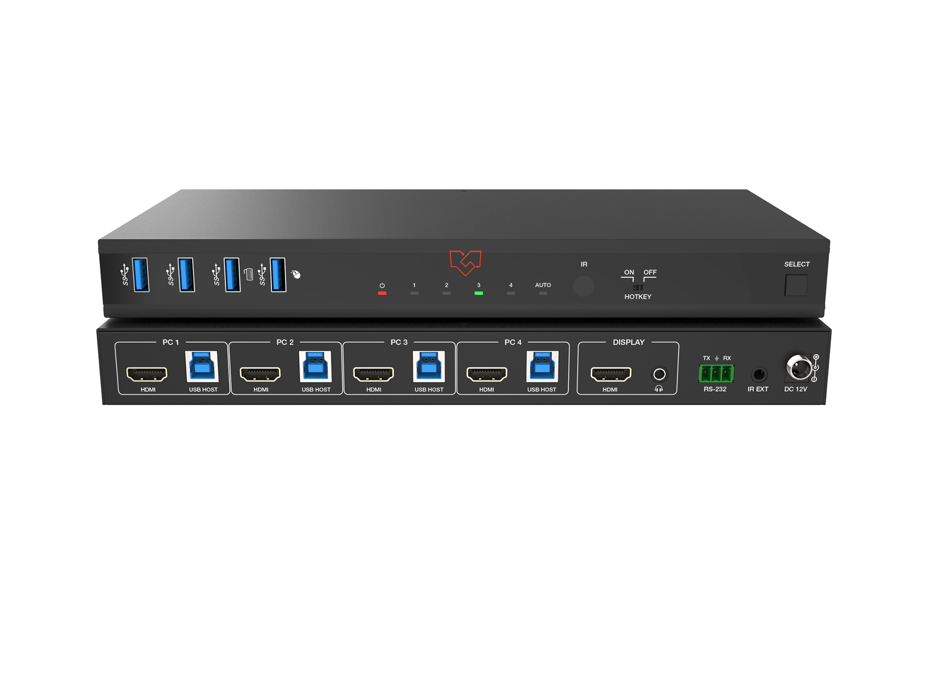 A virtual interaction feature automatically wakes connected PCs from standby, reducing switching time. Users can switch sources via front panel buttons, an IR remote, or hotkeys through a keyboard or mouse connected to the dedicated USB port.